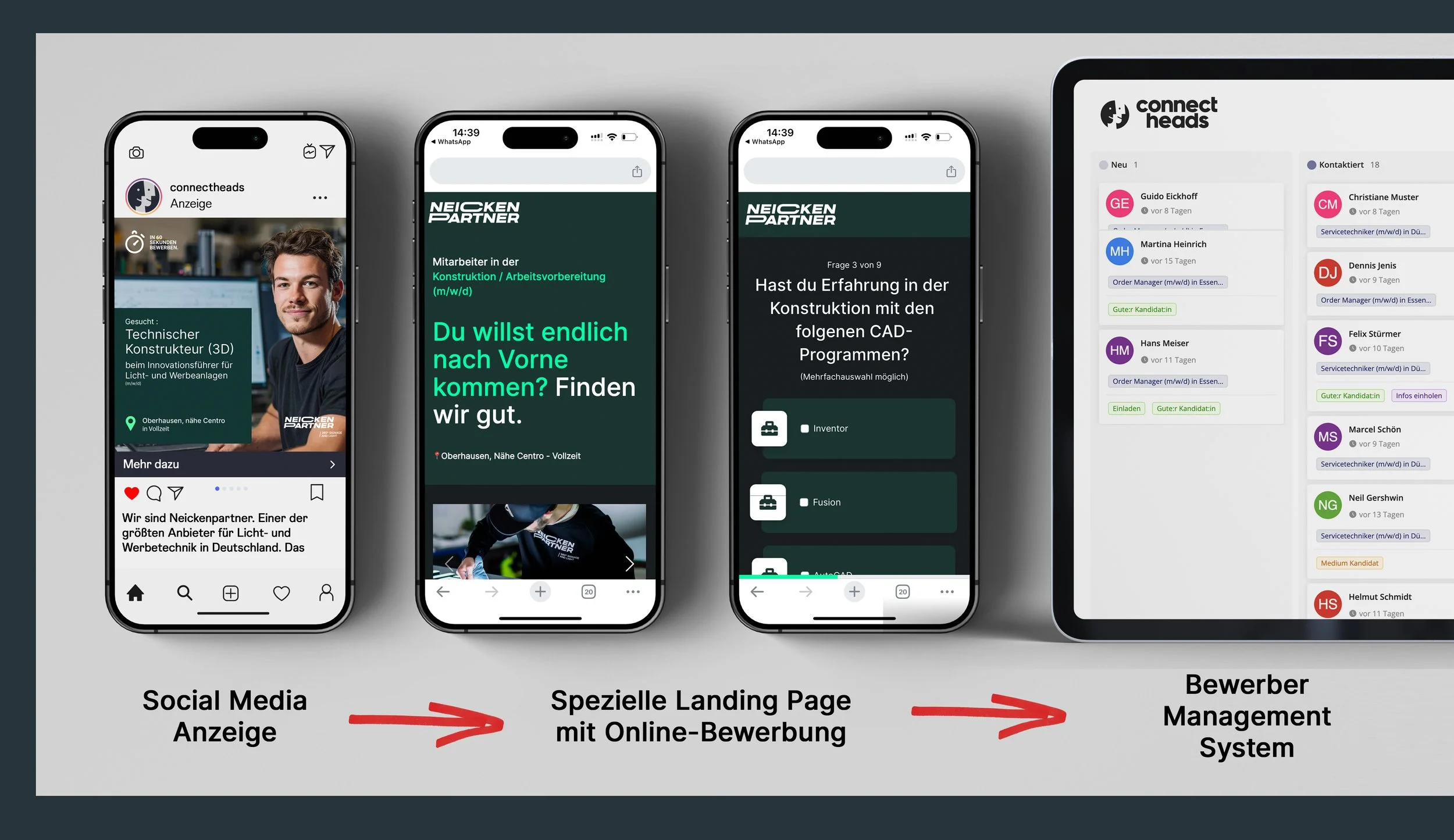 Über intelligent ausgespielte Anzeigen in Social Media und anderen Online-Kanälen erreichen wir streuverlustarm potenzielle Kandidaten. Sind diese interessiert, führen wir sie auf eine spezielle Landing Page, die Lust auf Unternehmen und Job machen. Über eine Art Online-Quiz ist es dann möglich, sich unmittelbar zu bewerben. Dabei fragen wir spezifische Informationen ab, die Ihnen eine erste Einschätzung ermöglichen.
